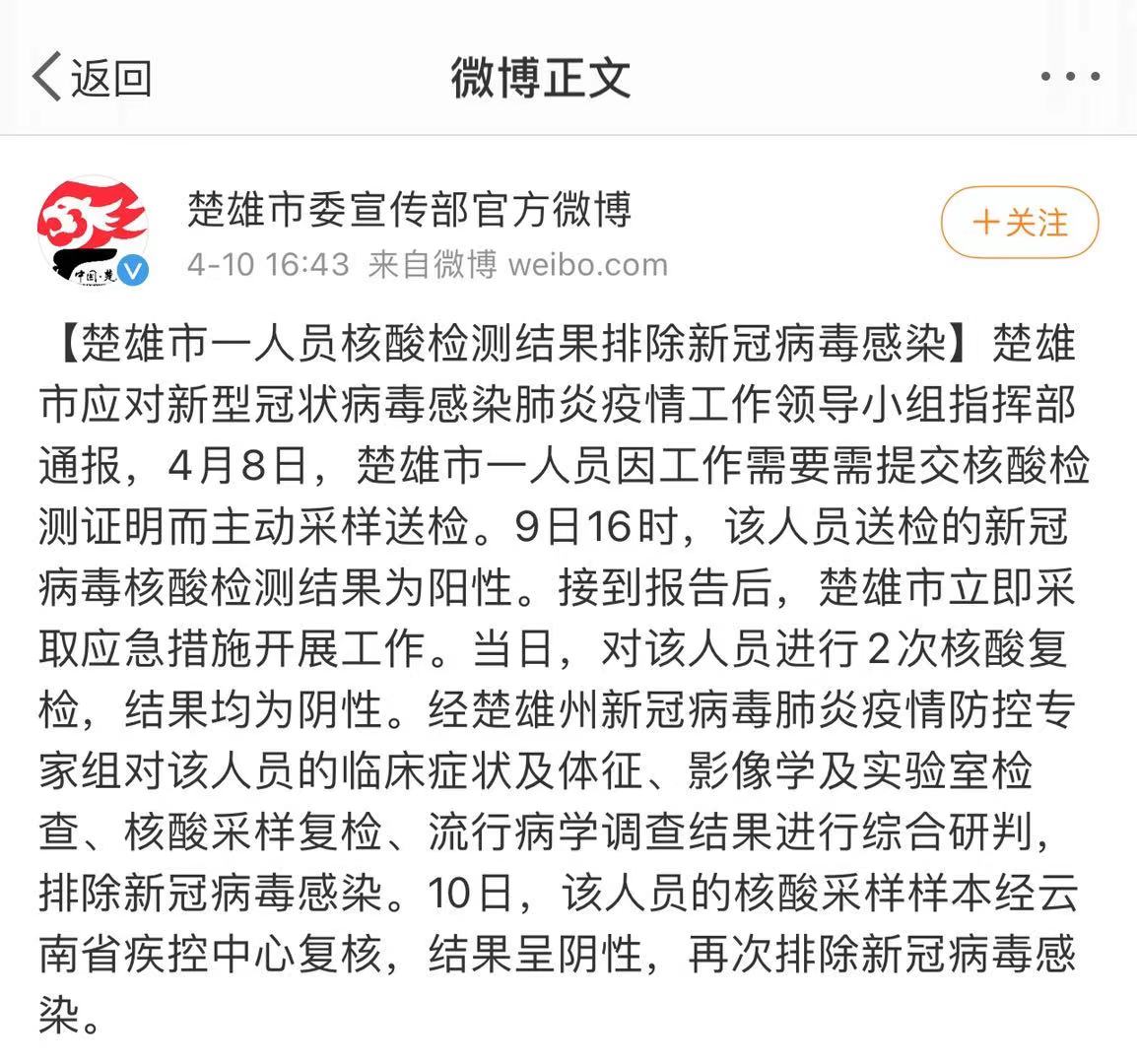 记者从楚雄市委宣传部官方微博获悉,48日,楚雄市应对新型冠状病毒感染肺炎疫情工作领导小组指挥部通报,916时,该人员送检的新冠病毒核酸检测结果为阳性。接到报告后,楚雄市立即采取应急措施开展工作。当日,对该人员进行2次核酸复检,结果均为阴性。