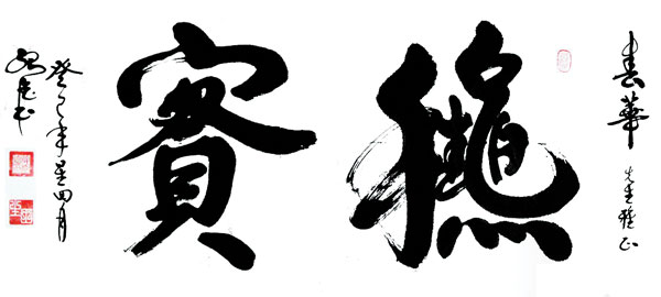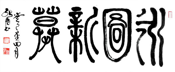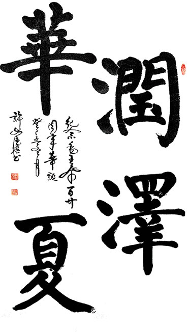 扎实的文化功底和丰富的人生阅历,是书法艺术的字外功。川北家乡,钟灵毓秀,让许绍德自幼耳濡目染;广阔天地炼红心的知青生活,使他坚毅不拔;金戈铁马的军旅生涯,铸就勇往直前的精神;研究生学历、三次做记者的经历,在国内外报刊发表作品600多件、获奖36次的实践,夯实了文字功底;25年的石油勘探生涯,让他饱览祖国大好河山;10多次的职务变换,使其阅人历事甚广;丰富深厚的艺术与人生积淀,使得许绍德先生创造了自己的书法世界。他并不是以临一家之帖见长的书法家,而是一位有完整书法体系与观念的书家。许绍德的书法以“气势”为表现形式,将字内功和字外功巧妙结合,将书法的润枯、粗细、动静与音乐舞蹈艺术相结合,形成了虚实相间、灵动磅礴的艺术风格。在他的作品中,经常看得见大山的巍峨、江海的奔腾、音乐的美妙、舞蹈的阿娜、宗教的神圣、花鸟的温馨。他的篆、隶、行、草、楷五种书体转换随心,小到扇面、大到六尺二字榜书均能做到收放自如。作品气韵贯通,意到笔随,神融墨畅,导之泉注、顿之山安,轻淡处薄如蝉翼,浑厚处重如崩云,回转处婉转蛇惊,师法造化、道法自然。