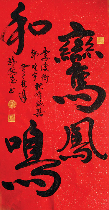 临池之外,许绍德认真研读历代先贤书法高论,遍购书法读物,博采众长,为其所用,形成了以“五韵”为精神内涵的书法风格。其书法气韵奕奕、情韵深沉、墨韵生动、线韵婉转、字韵有象。气韵是形与神之间的桥梁,是表达情性的介质。许绍德掌握了熟练技巧,运气达于毫端,以气行笔,点画之间气脉相通,气韵和神采表现得淋漓尽致。中国书法的笔墨具有丰富的表现力,许绍德常常通过行笔的刚或柔、粗或细、枯或润,来表现不同的韵味,达到形式上具有音乐的节奏感和艺术上的多样性之统一。线韵是中国书法主要的艺术语言,许绍德书法的起、承、转、合,通过张扬线条的韵律美,塑造出特定的形象,传达出丰富的情感。所谓“字韵”就是书法作品中字与字之间的韵律感。许绍德的书法主要表现为字之间的大小、疏密、轻重、浓淡、顾盼呼应等法理,宾主、虚实、避就、气脉连贯等。他把书法创作与美术构图原理相结合,做到形式与内容的有机统一,正所谓“书臻妙时书似画,画到佳处画如书。”