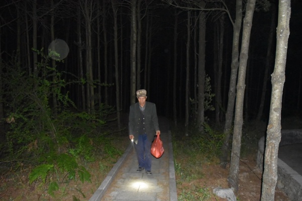 天色已晚,周边一片漆黑,唯有瞭望塔灯火通明。我们和她一起等待巡山的王石贵。不一会儿,一道光束在林子里拉长身影,来回晃动。满美焕熟悉这光,她笑着说:“是老头子回来了!”