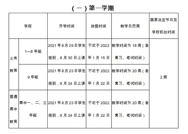 第一学期中,明确18年级2021829日学生报到,830日上课,不迟于2022115日放假;9年级2021823日学生报到,824日上课,不迟于2022122日放假;高中一、二、三年级2021823日学生报到,824日上课,不迟于2022122日放假。