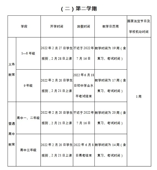 第二学期中,明确18年级2022227日学生报到,228日上课,不迟于2022716日放假;9年级2022220日学生报到,221日上课2022618日初中学业水平考试结束放假;高中一、二年级2022220日学生报到,221日上课,不迟于2022716日放假;高中三年级2022220日学生报到,221日上课,202268日高考结束放假。