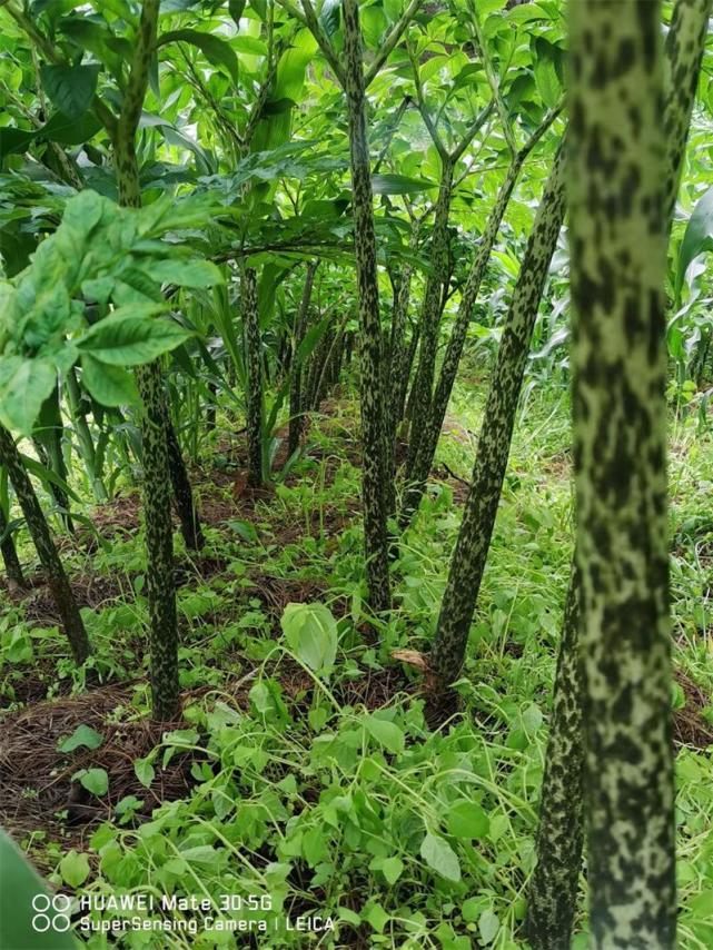 魔芋分为花魔芋、白魔芋和珠芽魔芋,都适宜在西南种植发展。花魔芋杆麻黒壮,横看竖瞧都似蛇蟒颜色,胆小的人和动物不敢误闯魔芋地,使得魔芋少损伤,少病害。