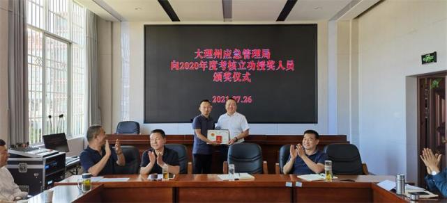 7月26日上午,大理州应急管理局召开2020年度工作总结表彰会议,并对荣立三等功的办公室主任杨俊松进行颁奖。