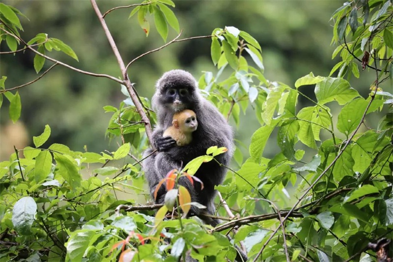 菲氏叶猴(也称白头叶猴、灰猴、长尾猴)是较为典型的东南亚热带和南亚热带的树栖叶猴。在古城山子保护区,生活着20多只菲氏叶猴。猴宝宝出生两三个月,毛发呈金黄色,之后逐渐变成灰色。成年后的菲氏叶猴,拖着长长的尾巴,全身穿银灰色“外衣”,黑黑的脸上,炯炯有神的眼睛和嘴周围有着些许白色茸毛,常常给人一种“化过妆”的既视感。