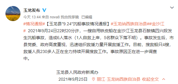 (云仲肖9月25日,玉龙县人民政府新闻办就玉龙县“9.24”沉船事故发布了情况通报,以下为全文: