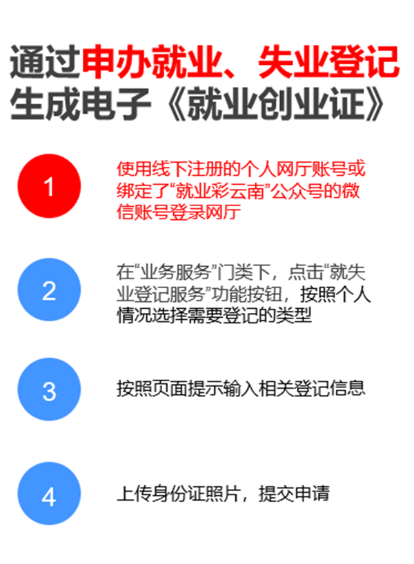 目前,劳动者可通过登录“就业彩云南”微信公众号,点击业务大厅中的就失业登记,按照个人情况选择需要登记类型进行相关内容的填写申报后,审核完成就业失业登记成功即可生成电子证。同时可在“云南公共就业服务网”进入云南省公共就业服务平台网上办事大厅,在“业务服务”门类下,点击“就失业登记服务”功能按钮,按照个人情况选择需要登记的类型,填写相关信息提交申请,审核完成即可申领。