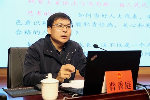 培训会上,普香庭以《勇于担当,善于履职,做一名优秀的人大代表》为题进行授课,他从“人民代表大会制度的发展历程、人大代表的权利和义务、人大代表如何提升依法履职能力、当好新时代合格人大代表”几个方面予以全面、深入地解读。