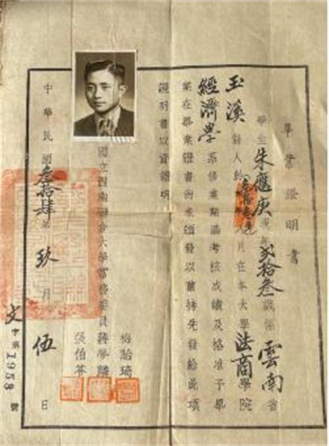 朱应庚先生是云南玉溪人,1944年毕业于西南联大经济系,此后留学美国获美国密执安大学经济学硕士学位,1949年回国后一直在云南大学执教,曾任云南省经济学会会长,全国财政学会、外国经济学说研究会、美国经济学会、中国国际金融学会等学术团体理事,云南省政协委员(1983)、省政协常委(1988)、省政协副主席(1992)等,属于云南经济学界“凤毛麟角”的顶尖级专家学者。