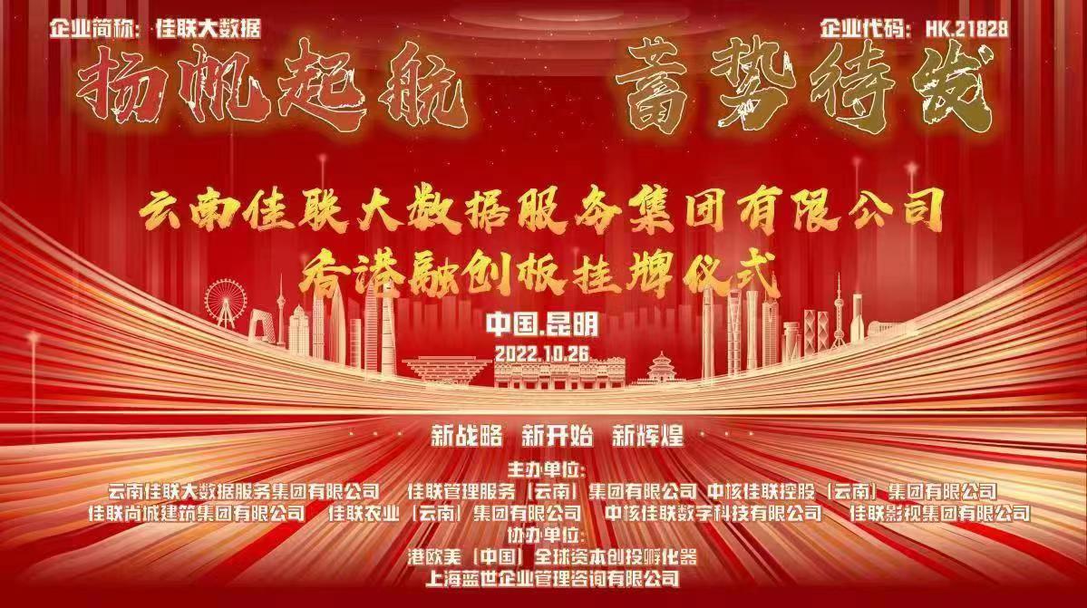 2022年10月26日,云南佳联大数据服务集团有,以“国际中小企业股份转让系统挂牌”为主题的,港交所挂牌敲锣仪式,在云南昆明世纪金源大饭店一楼会议厅隆重举行。来自全国各运营中心、服务中心及子公司的董事长、总经理、核心股东;集团公司各部门高管;各商会、协会代表;政府部门相关领导;各行各业企业家代表共约300余人出席了会议。