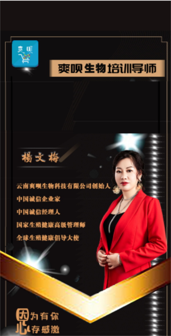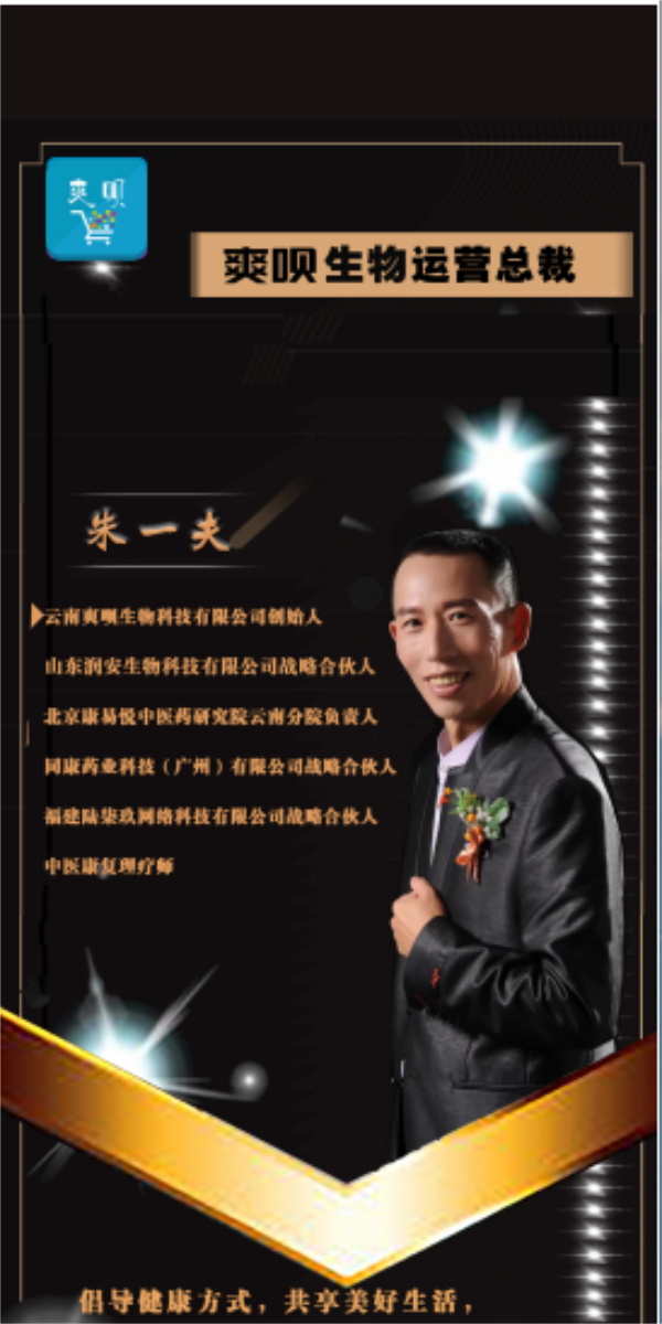 公司简介:云南爽呗生物科技有限公司启航于2017年,是在云南省云品出滇大战略背景下成立的一家线上线下大健康管理服务平台。2018年作为创始人之一成立了北京康易悦中医药研究,2022年成立云南分院,并借势云南中草药生物特色优势,集产品研发、生产、销售一条龙产业链和多家工厂渠道供应链,科学人性公平管理机制,最具时代感的创新模式和完善售后服务,以三通一养为健康养生理念,着力打造“滇展年”品牌为核心,为扩大云南特色品牌影响力,创建知明品牌企业,让世界共享云南,实现健康中国梦贡献自己的智慧。 未来3-5年公司将规划在全国落地10家子公司,100家以上地市运营中心、每区县一家服务中心及3000家以上社区直营店或联锁加盟店,全心全意为社区、乡镇老百姓提供康养咨询服务。
