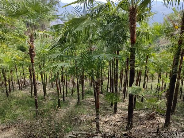 采访期间,恰逢施甸县由旺镇农民杨定国采购棕苗,他说:“前几年搞建筑积攒了几万块钱,投资什么也拿不准,就在自己的21亩山地上种植甜棕苗,先种十亩三年苗,再采购60公斤种子,自己育苗慢慢栽培,三年时间种满,七八年时间自己满60岁,管理棕树无技术含量,除草施肥投入劳动力不多,也算是给自己种一片养老树。”