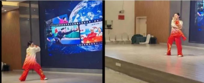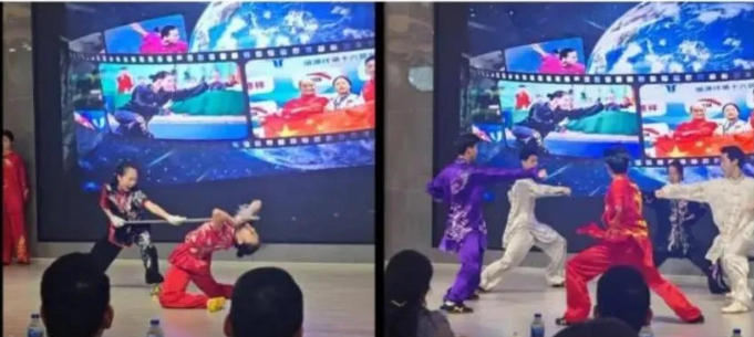 集体28式太极扇(李娜等人)行云流水,3分钟内尽展 中华太极神韵。越南学员的华龙拳法刚猛,诠释东南亚武术的凌厉风格。