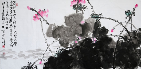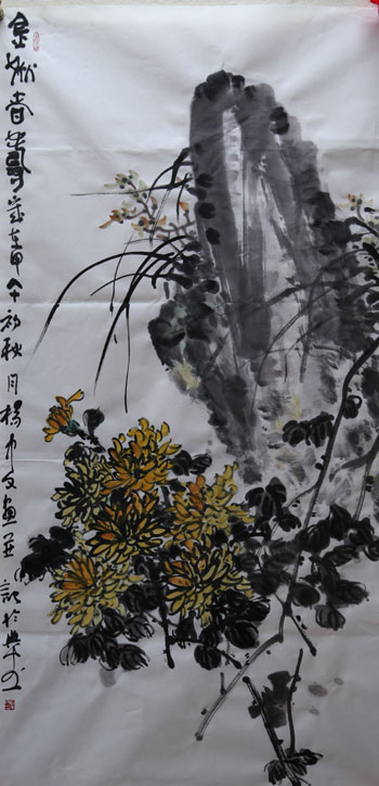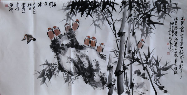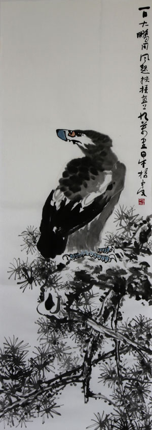杨中文的画,多为茶余饭后之雅玩,按他的话说就是涂鸦助兴。由于他有着深厚的书法功底、不俗的审美意识和造型能力,往往着墨不多而风神自清。杨中文喜爱写梅兰竹菊,也偶然画几张山水。他笔下的花草,着墨不多,构图简洁,并不在意什么画理,所谓“下笔草草,聊写胸中逸气”,用书法的笔意勾勒所见所想的物象,设色无法而自成一格,尤其是其笔下的雄鹰,重在写趣而不求形似,下笔灵动,疏密随形,张弛达意,尽显英雄气概;浓淡干湿,设色典雅,咸有佳趣,彰显笔墨情怀。杨中文的山水画洗净浮华,构图简淡,静处求之,每下笔落墨,辄思古人用心,乃悟一点一拂,皆有风韵,一石一水,皆有位置。渲染有阴阳之辨,着色有今古之殊。尤其是画中的题款,不可或缺,多而不为之拥塞,寡而不失之疏狂。亦字亦画,互为补充,相得益彰。黄宾虹说:山水的美在“浑厚华滋”,花草的美在“刚健婀娜”。笔墨往往重在“变”字,只有“变”才能达到“浑厚华滋”和“风健婀娜”。杨中文明白了这个道理,所以他的画让人读来清新脱俗,耳目一新。