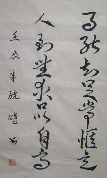 规律之三就是寻找共同点。杨统时认为草书中很多字都有一个共同点:就是由阿拉伯数字的“3”为基本元素构成的,他指着自己写的一幅书法作品为实例说:“事能知足常惬意,人到无求品自高。”这个对联的上联7个字中,事字,能字,常字,惬字,意字都是由阿拉伯数字的“3”字组成的,从某种程度讲写好“3”字,草书就得了三成,四成了!