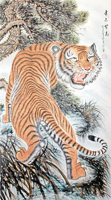 刘军在当代是画虎的佼佼者,称得上是专家。因为他不仅对如何画虎很有造诣,对虎的文化也有颇有研究。这得益于长期中国传统文化的津润和熏陶。刘军的虎气韵生动威猛,笔墨娴熟老辣,墨韵淋漓丰富。虎的造型结构明确,逼真而传神,尤其虎眼威而狡诈真实的表现虎的性情。刘军说:“百年虎是白色的,千年虎牙齿脱落头生角。……老虎出行前爪画地知冲破。可预知凶吉,虎真乃天生神物也”。如此神奇让听者闻所未闻。刘军虎系列作品受到海内外鉴赏家及收藏家青睐。