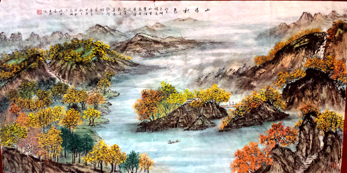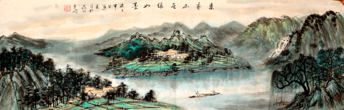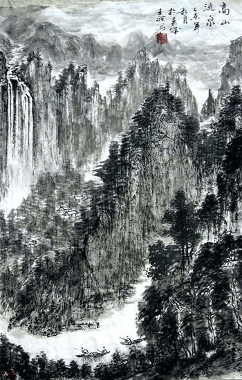 谢赫六法“气韵生动、骨法用笔、应物象形、随类赋彩、经营位置、传移模写”中后五法,即使一般人真实地付出努力,做到也不是太难的,唯“气韵生动”注重的作者的文化、修养和德操等画外的功夫,是至难的。宋代郭若虚《图画见闻志》中说:“人品既已高矣,气韵不得不高;气韵既已高矣,生动不得不至。”扬雄曾说:“言,心声也,书,心画也。心画形,君子小人见矣。”郭氏更注解道:“画,犹书也。”可见一个人品德的高尚与否直接决定作品的优劣。王体醉心于书画,完全是出于对中华传统文化由衷的热爱,将书画当作修身养性的爱好,不名不利、无派无家,不掺杂丝毫功利心在里面,对于喜欢他的书画的人,古道热肠的他从来都是有求必应,乐此不疲。人品淳厚,思想纯正,使他的画作表现得很纯粹、很干净,有一种斯文和高古在里面。画作《春潮江水平》中,遍绕青岚的远山逐渐返青,山下的江水没有一丝涟渏,渔船泊于江岸。几间茅舍静隐在江边开得正好的桃花下,一派阳春景象。细腻的笔触将画面处理得静得令人仿佛误入于五柳先生笔下的桃源,悠然而忘归。《山高流泉远》写意中,在瀑布的惊雷声中,莫不是诗仙指点江山,吟哦“飞流直下”?继而又在《秋深正好觅诗句》的兀立危峰上,以斗酒诗百篇的高才与友人切蹉新得之句?尽兴之后,携童儿归途中在落木萧疏中《秋游》一番。王体的一幅幅作品,总给人一种穿越亘古的力量,启人遐想,令人神往!