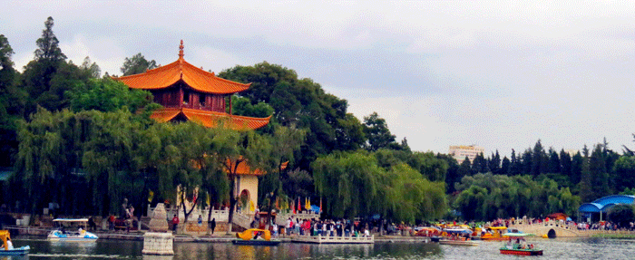 下联:小岛石韵,崴崴坚魂。千年虎峰敛楼台,万虚挂星衬河月。长联携楹门,古亭俨暗昧,邂逅台隍作词赋。思徸徸讲武戎马,金戈铁鞍。诮靓靓五华陈圆,却霸慕皇。印赤赤金殿铜瓦,灵筑雄章。忆浩浩汉武征南,庄驾文山。憾堂堂长伯削藩,成灭黄弦。数雄雄庄硚王滇,归秦置郡。地缘命中福,天昊运里财,气远常昭。狮山文帝隐身归佛,怒江红河玉溪。石林旖旎秀龙门嵎峦鹿扣丽江。奇亮如神擒纵抚蛮越泸沽。颂南诏赞可渡,七市八州载史册,保山国殇,和顺珺黄。彝人太阳历,禄龙白族茶,火把目瑙德宏瑞丽乡。版纳泼水名四海;普洱临沧纵谣歌;季春大理颂五洲;楚雄土火亮尘世。苍梅褔何往?三圣迎诸尊。南域胶林,建水文庙,哀牢俯瞰螳螂。西汤有情,腾冲安宁,三江并流惠通。东铜个锡,曲靖会泽,古爨碑颜珠源。北连丝路,迪庆中甸,昭通摩崖通衢。天拥地,地拥人,人拥天。天地人三才,圣杰经典。春城廓厦,原民板板开启,郑和蔡锷。滇中盘龙扎扎读耕,诗书继承。红军鹰翱翱飞越,丰功卓著,聂耳继尧。俊勾沉烈烈捐躯,将士精英。古往今来。万古夷滇高原魂魄才子佳人颂肝肠;千载俊灵垂功拓荒三迤,重阳护国,忠骨献大我宏真善。风骚独领。